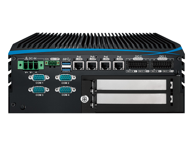 4 PoE+ GigE LAN, Workstation-grade 9th/8th Gen Intel® Xeon®/Core™ i7/i5/i3 Processor (Coffee Lake) Expandable Fanless Embedded System, 4 front-access SSD tray, 1 PCIe x16 slot, 1 PCIe x4 slot, 3 SIM, 6 USB 3.1, 4 COM RS-232/422/485, 32 Isolated DIO, high-performance, rugged, extended temperature